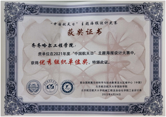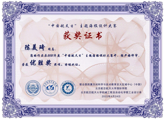 此次2021年“中国航天日”主题海报设计大赛由联合国附属空间科学与技术教育亚太区域中心(中国)、北京航空航天大学国际学院、北京航空航天大学机械工程及自动化学院工业设计系联合主办。在所有参赛选手中,我校视觉18级杨植婷、陈美琦同学分别获得三等奖和优秀奖,学院获得优秀组织单位奖。