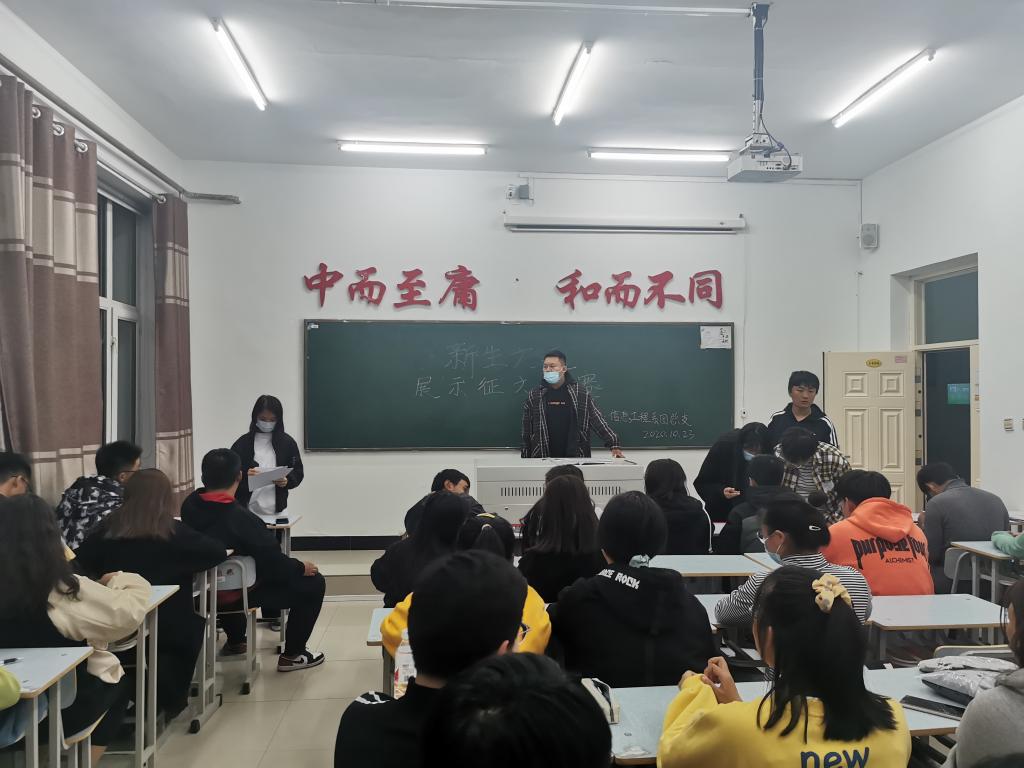2020年10月23日,信息工程系团总支于1#1406开展“新生文采展示征文比赛”活动,本次比赛以“我的大学—我眼中的学长与学姐”为主题,由信息工程系团总支组织部部长王帅主持,信息工程系2020级各专业40余名参赛新生自选角度书写文章。
