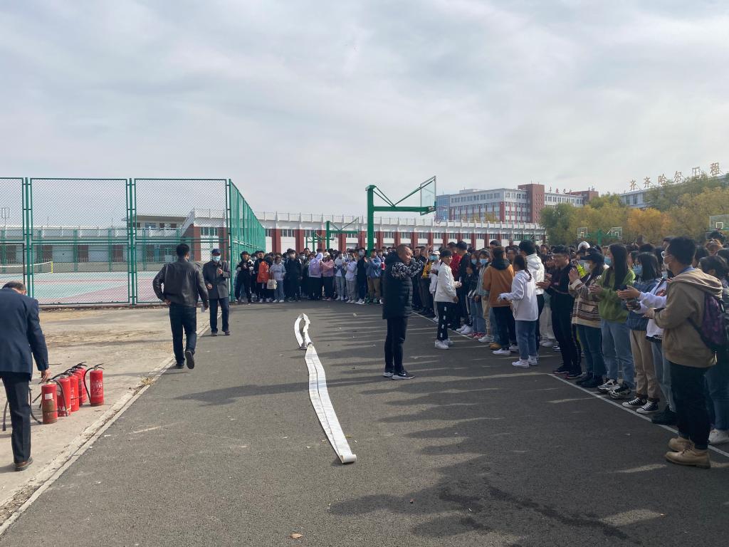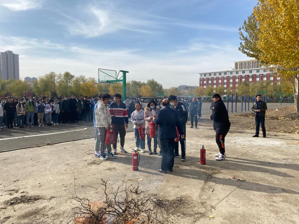 随着疏散指示的响起,各位同学弯着腰、安全、迅速、有序撤离到指定疏散地点。随后,总务处长和保卫处长分别讲解了有关火灾现场的应急处置方案、灭火器的使用以及相关的注意事项。并亲自演示了灭火器的使用方法;在认真观摩后,同学们亲自体验了现场灭火的过程,面对燃烧的火堆,很多学生自告奋勇上前使用灭火器进行灭火,同学们表现的十分沉着,熟练地按照灭火的步骤和方法,将燃起的浓烟大火成功扑灭,做到了冷静沉着的面对突发现象,成功快速的扑灭火灾的消防标准。