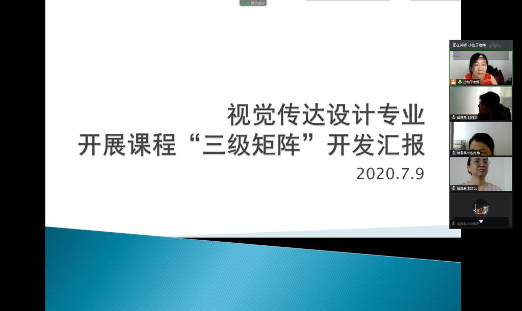 依据专业的发展需求,视觉传达设计专业于2020年7月9日在腾讯会议平台上召开了关于课程开展“三级矩阵”的汇报,视觉传达设计专业的全部教师参会。