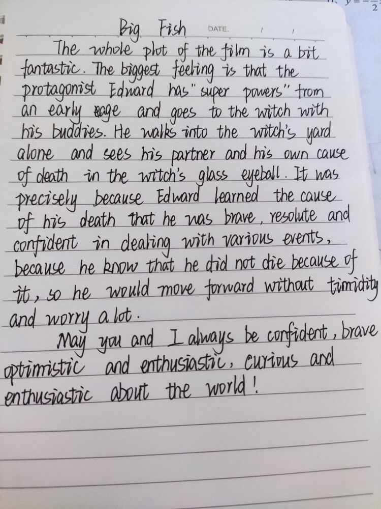 在观影结束后,手写100字以上的观后感是我们对电影的理解与感受,也是我们对句子,语法,词汇表达的积累。在感受英语语言魅力的同时,也可以练习英文书写水平,同时提高我们的英语技能。