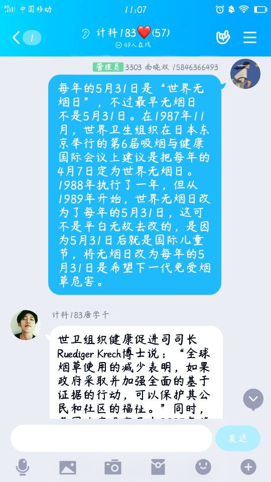 为让学生了解烟草危害,提高对自身健康的重视。2020年5月28日,计科183班开展了“世界无烟日”主题活动。本次活动由团支书主持,计科183班全体成员参加。