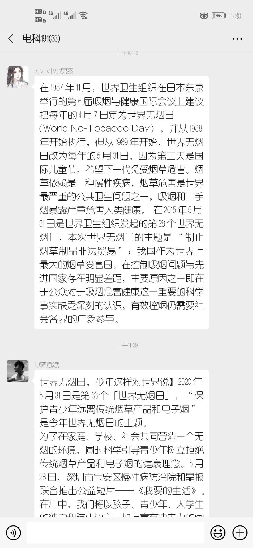 为让学生了解烟草危害,提高对自身健康的重视。2020年5月28日,电科191班通过班级微信群开展了“世界无烟日”主题团活。本次活动由组织委员康佳慧主持,电科191班全体成员参加。
