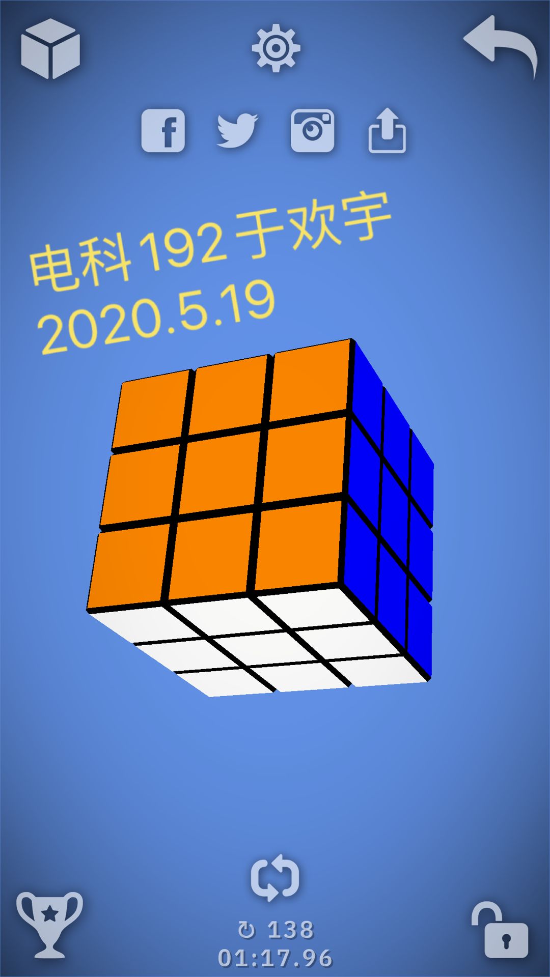 为了让社员们学习复原魔方更迅速,我们引导社员们下载一个线上就可以复原魔方的软件,并在每次复原后截屏用来取证,然后评选出复原魔方次数最多以及速度最快的社员来评奖。大家第一次接触这个软件,单曲的的成绩和效果都很显著,更多的社员也因为手中没有实体魔方而采用这款APP用来练习。很多社员表现突出,在这次比赛中取得了良好的成绩。