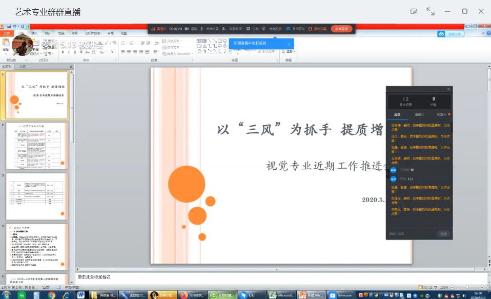 2020年5月13日下午,视觉传达设计专业利用钉钉平台召开 了以“三风”为抓手,提质增效专题教研会,并就近期工作进行安排,视觉传达设计专业的全体教师参会。
