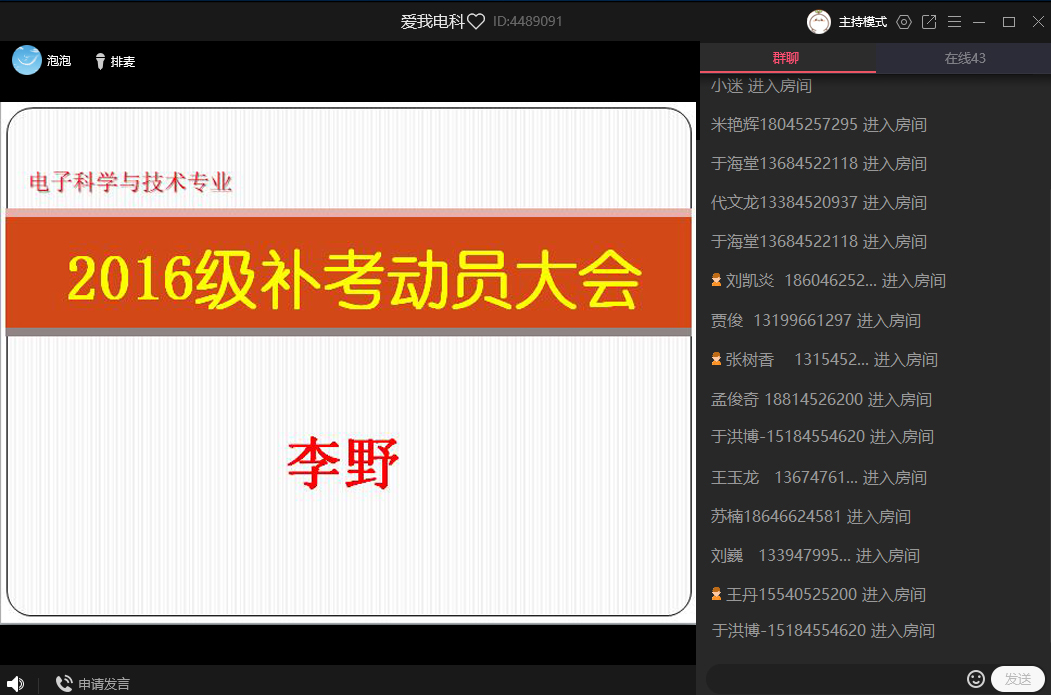 作为一名当代大学生,应该努力把握好宝贵的大学时光,全面提升自身的素质。其中,完成学业是学生的本职工作,学校历来重视学分问题,本学期虽然受到疫情影响,学生不能返校,但学校仍积极安排了相关补考工作,为了使补考同学能顺利通过,2020年5月11日,李野老师用线上直播的方式,通过网络为电子科学与技术专业2016级补考学生主持召开了考前会议。
