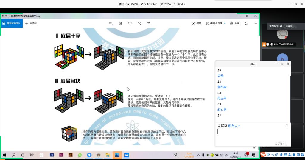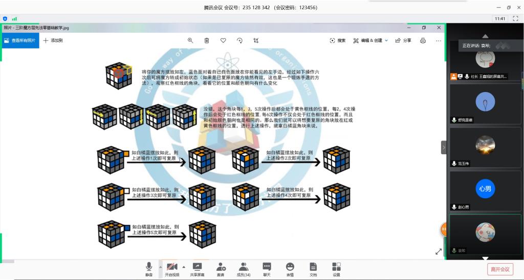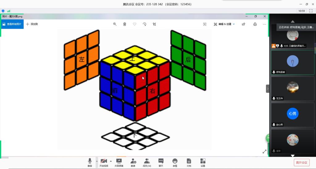 由于疫情的原因,导致社团活动在线上进行,也是第一次在腾讯会议上开展活动,但是活动效果很好,社员们畅所欲言,达到了活动目的。同时,同学们对魔方的了解也又增加了一点。很多社员在活动时表现突出,发表自己的见解,由于大家手中都都没有魔方,所以我们提前在电脑上绘制了魔方的概念图,可以让社员们参照并更真实的了解魔方的构造以及技巧。