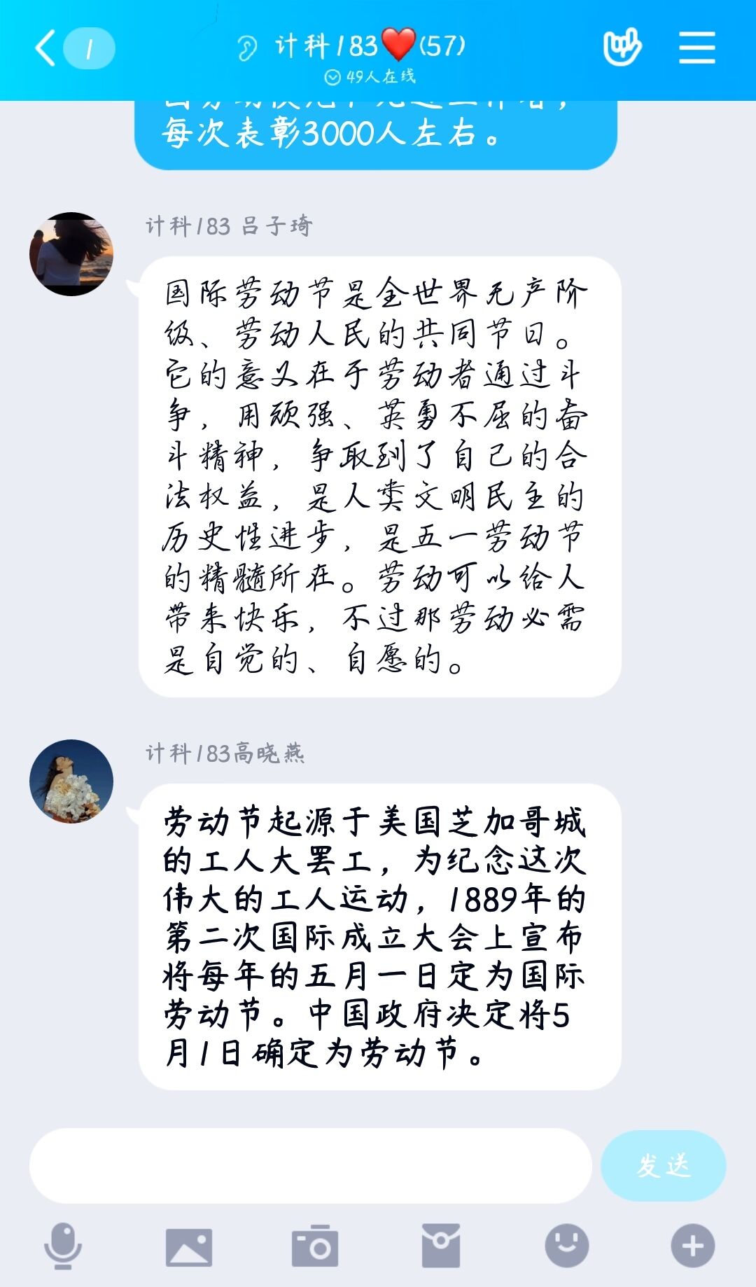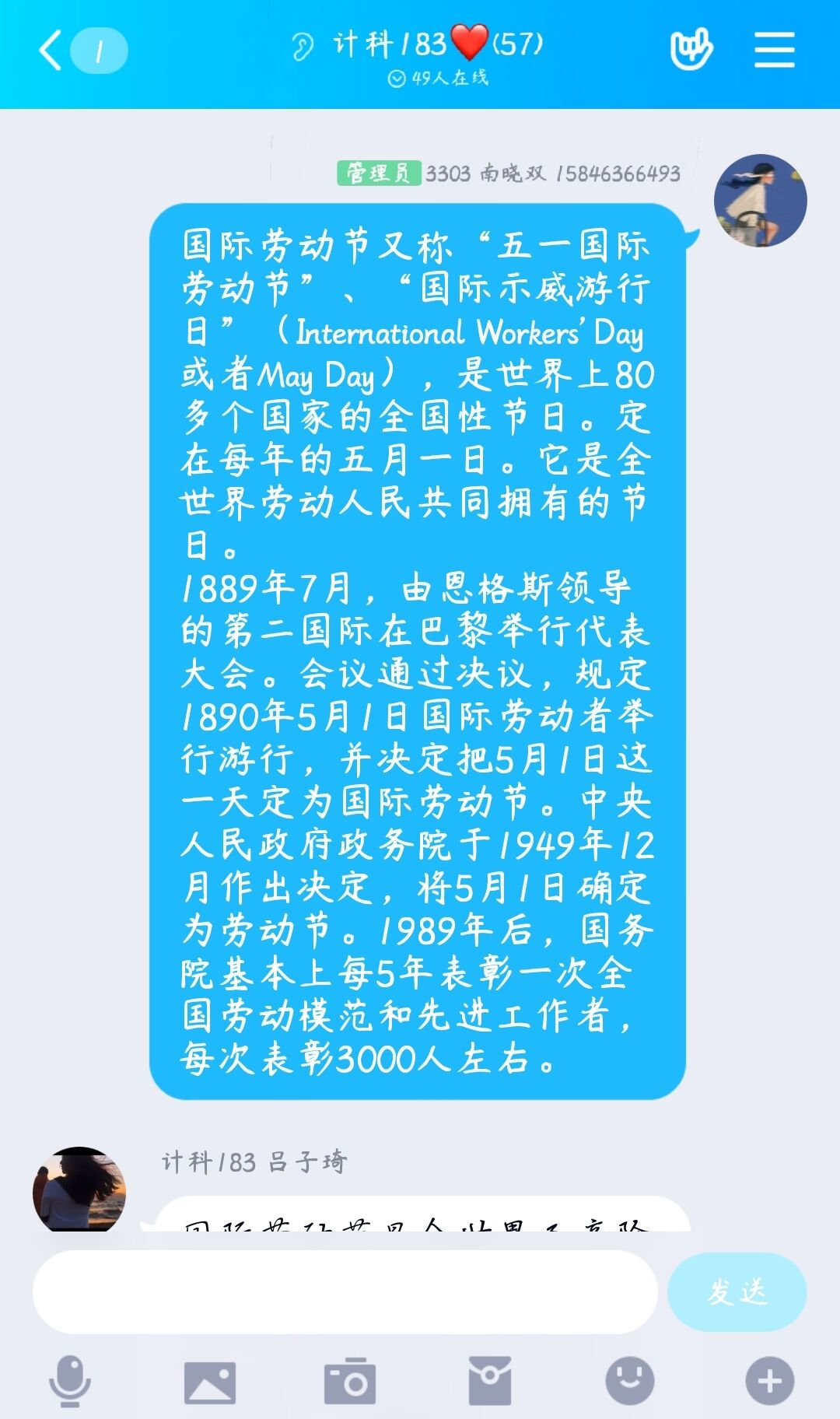 为了增进同学间的感情、发挥团队协作精神。2020年5月1日,计科183班开展了以劳动节为主题的班级活动,此次活动由组织委员主持召开,计科183班全体同学积极参与。