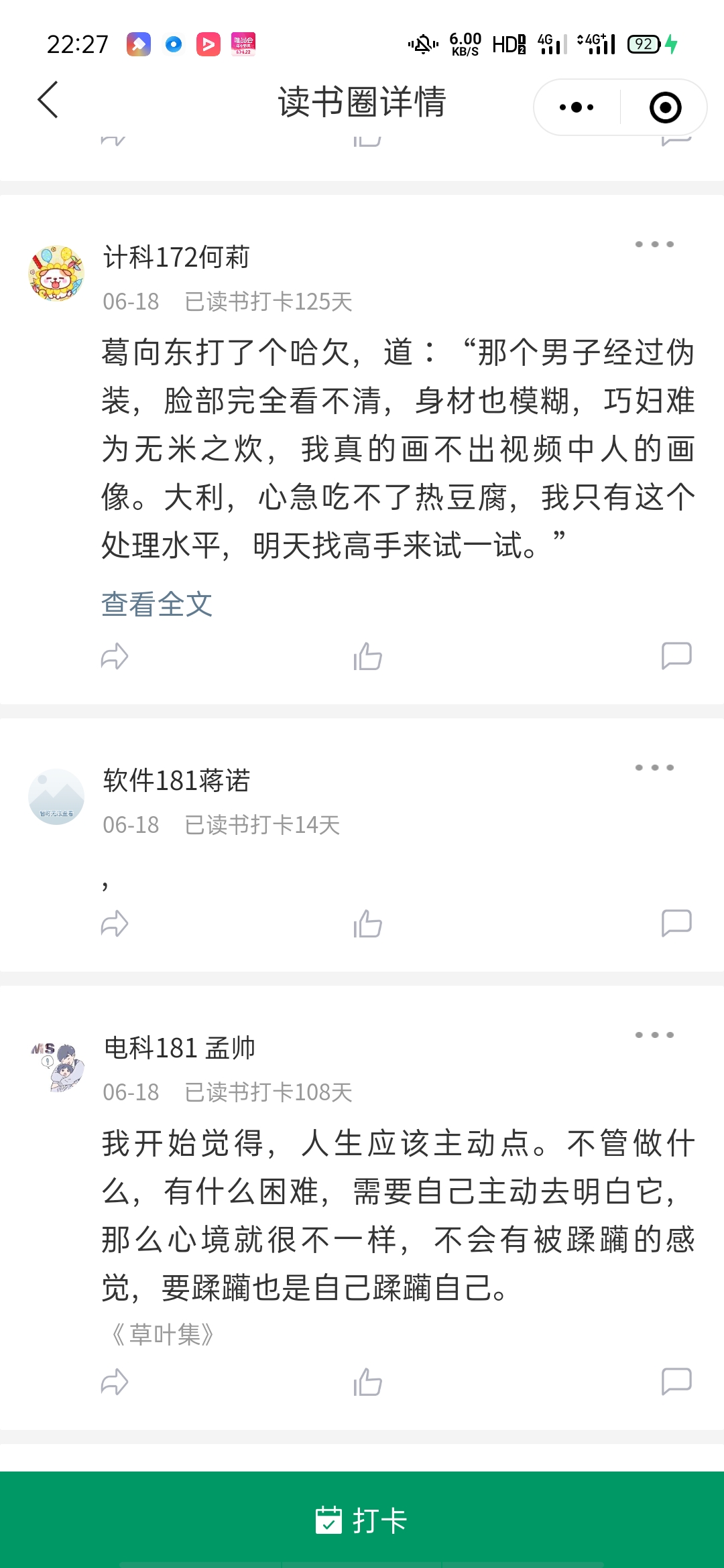在微信读书APP中选择积极向上的书籍观看,观看之前截屏之前已读书籍排行榜时长,观看之后截屏参赛书籍读书时长(全屏截图不可取一部分截)。每天阅读时长30分钟以上,截屏两张图后到微信小程序全民读书打卡圈子进行打卡,写下当天感悟不少于300字,并配上当天读书时长前后截图,需持续打卡七天。