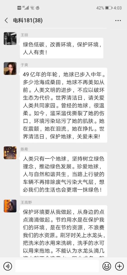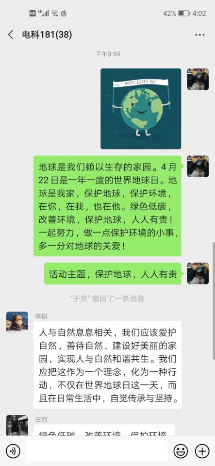 2020年4月22日,电科181班全体成员在线上讨论有关世界地球日的相关内容。 世界地球日活动旨在唤起人类爱护地球、保护家园的意识,促进资源开发与环境保护的协调发展。保护生态环境是件长久的事情,必须要持之以恒。保护环境,是我们每一个人义不容辞的责任。 通过此次线上活动让我们了解了,世界地球日让我们每个人审视人与地球的关系。我们只有一个地球,珍爱美丽地球、守护自然资源,就是在保护我们的家园。