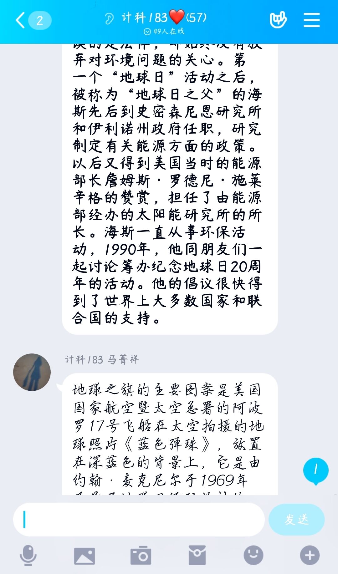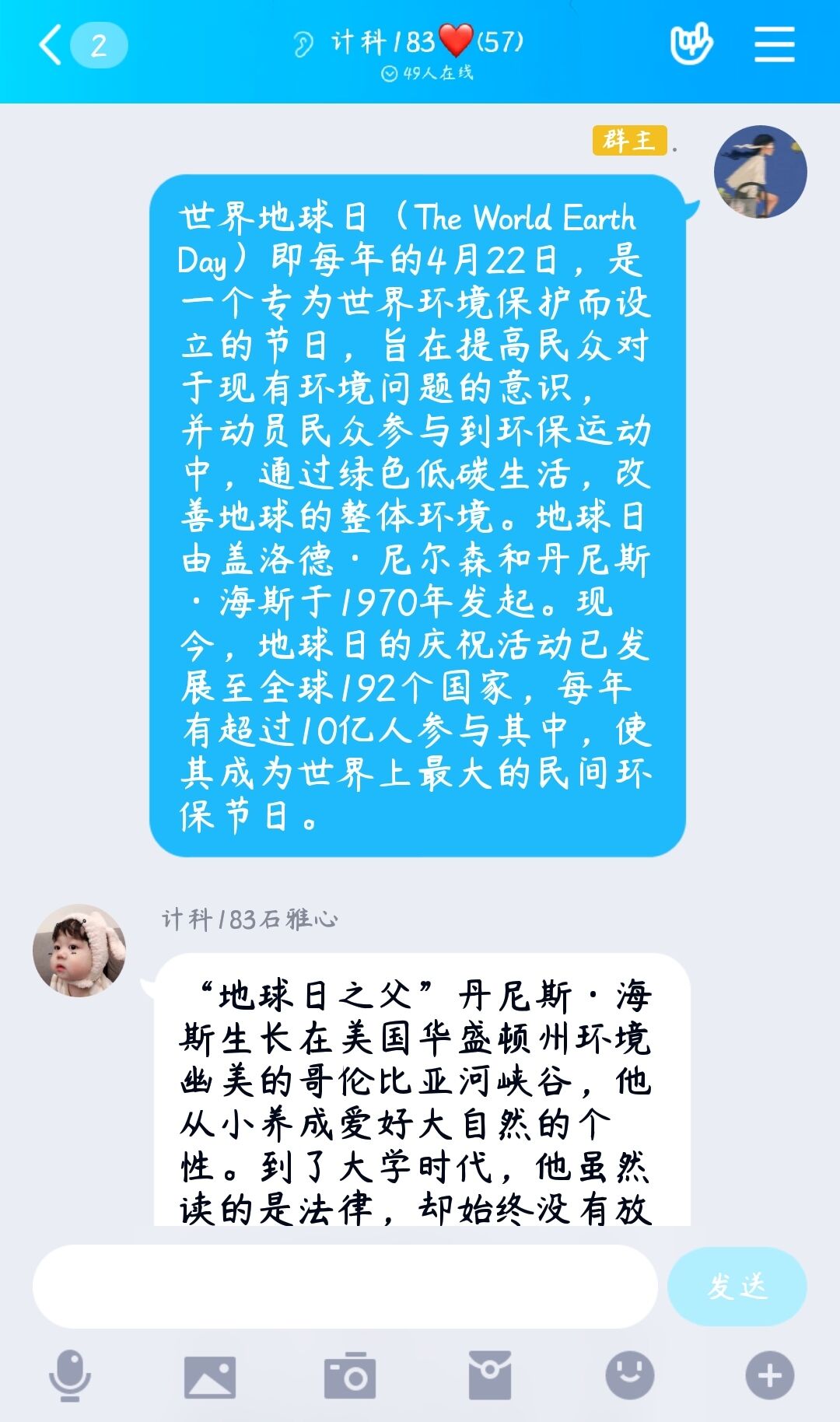 为了倡导同学们从生活的小事做起,少制造垃圾、合理处理废弃物,用我们的实际行动来维护绿色家园,2020年4月22日,计科183班开展了“世界地球日”主题活动。本次活动由团支书主持,计科183班全体成员参加。