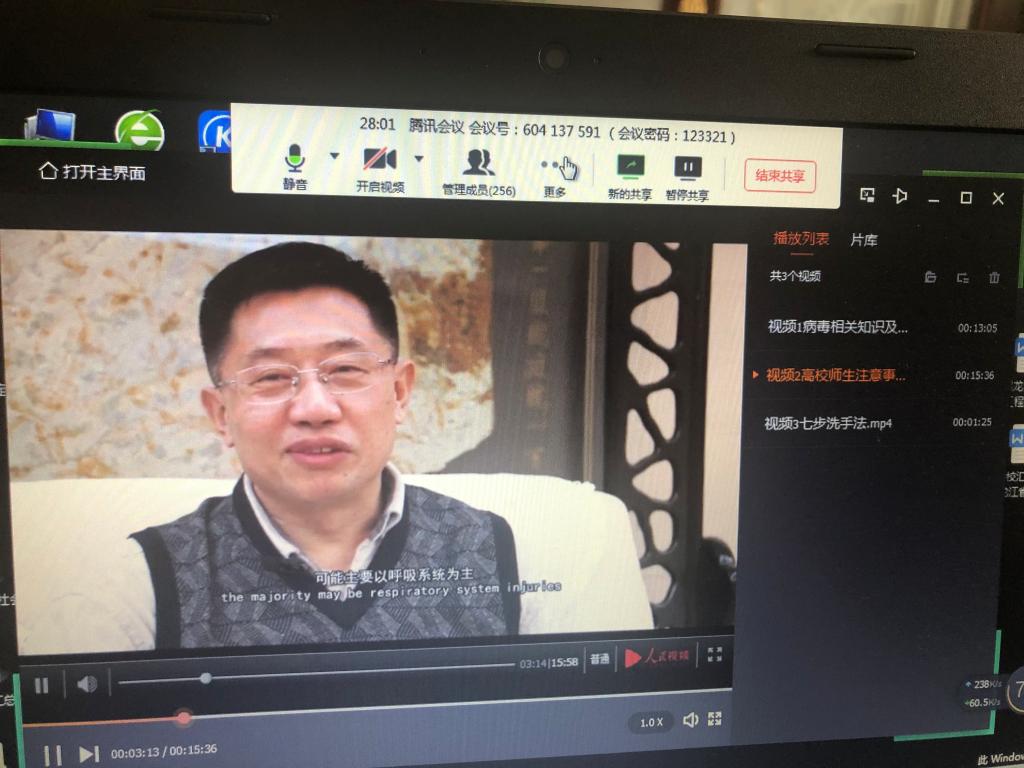 由于疫情原因,此次会议采用网络视频方式,将信息及时准确的告诉了同学们。会议正式开始前辛昊老师亲切的问候了解同学们的健康状况和学习情况,并要求大家虽然在家但也绝不能放松,要做到学习防疫两手抓。11:30分会议正式开始,辛昊老师分别为大家播放了“病毒相关知识及传染连”和“高校师生注意事项”两个视频,并督促同学们认真收看。视频结束后,辛昊老师根据视频内容用更加平易近人的语言生动形象的为同学们讲解了病毒的相关知识以及注意事项,使同学们对病毒和防控有了更深刻的认识。会议最后老师采取提问方式检查同学们的学习情况,并一再督促同学们要做到学习防疫两不误。