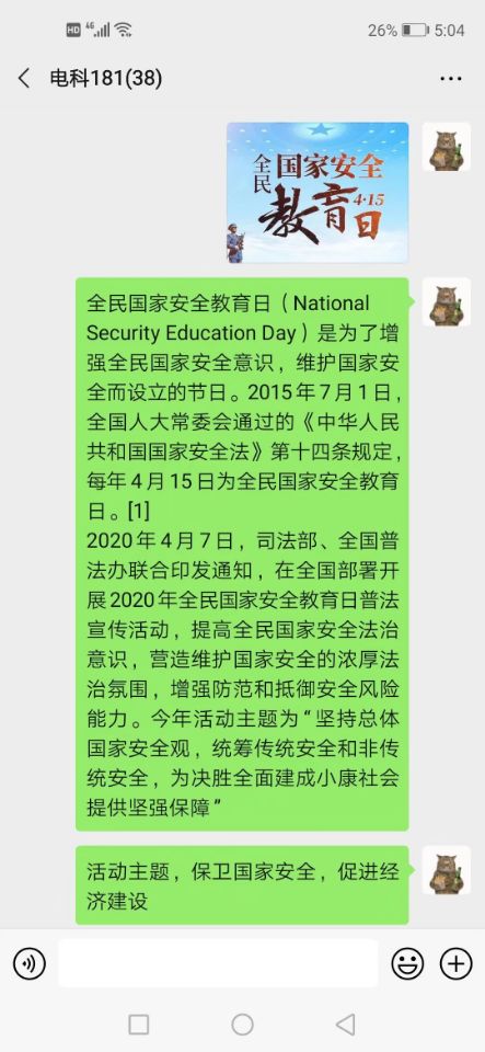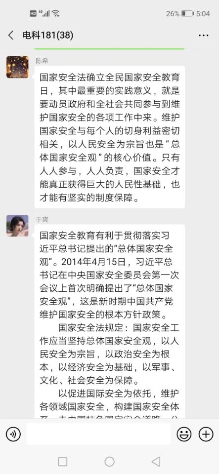 2020年4月15日,电科181班全体成员在线上讨论有关全民国家安全教育日的相关内容。