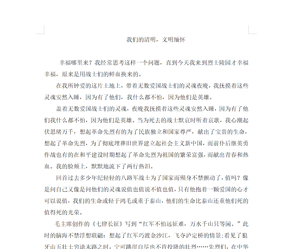 活动开始,同学们为表对传统节日的传承以及对英雄烈士们的崇高敬意,都积极踊跃的参加此次互动,通过他们撰写的有关“祭莫英烈、感念亲人、追忆先贤缅怀主题征文”紧扣“传承红色基因”主线,从细微的字里行间无不体现出他们对祖国、对传统、对英雄、对红色基因的传承与崇拜。