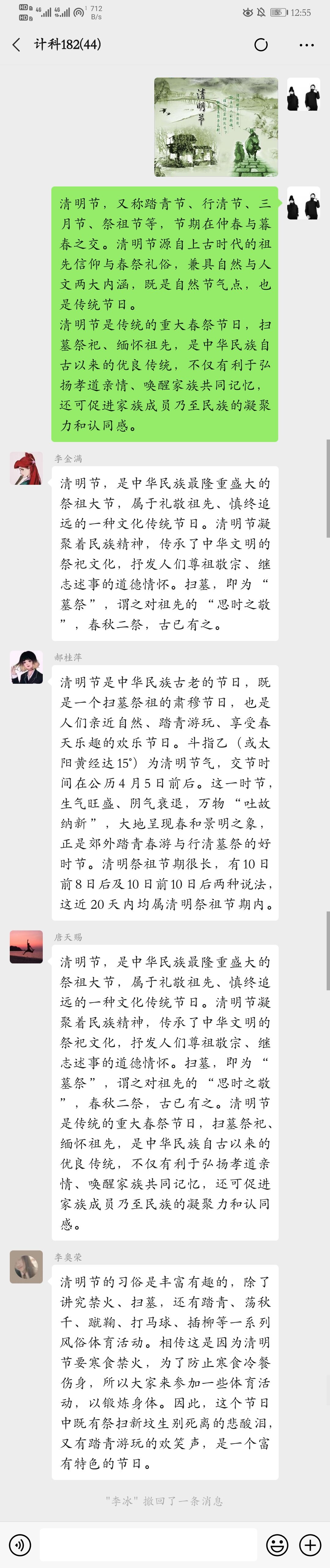 3月31日,在团总支的号召下。计科182班在微信群中展开“清明节”主题活动,此次活动由计科182班组织委员主持。大家在群中踊跃发言,发表自己对于清明节的理解,关于清明节的由来、习俗以及含义等。大家在群中各抒己见,通过每个人的发言,让大家在沟通中更全面的了解“清明节”这个传统节日。