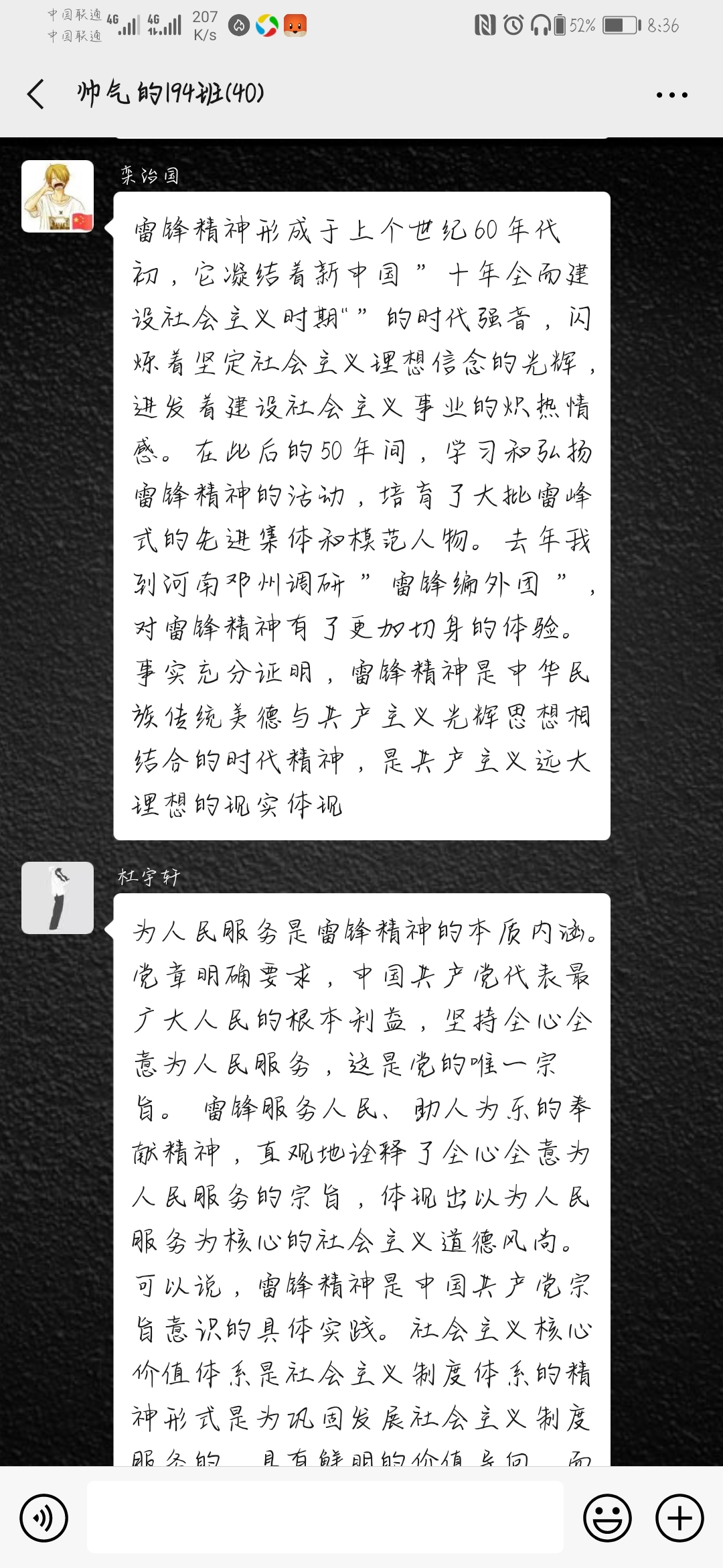 杜宇轩提到:“为人民服务是雷锋精神的本质内涵。雷锋同志服务人民,助人为乐,直观的诠释了中国共产党全心全意为人民服务的宗旨,体现出以人民服务为核心的社会主义道德观。”同学们也对本次团伙主题积极发言,从不同角度展开热烈讨论。