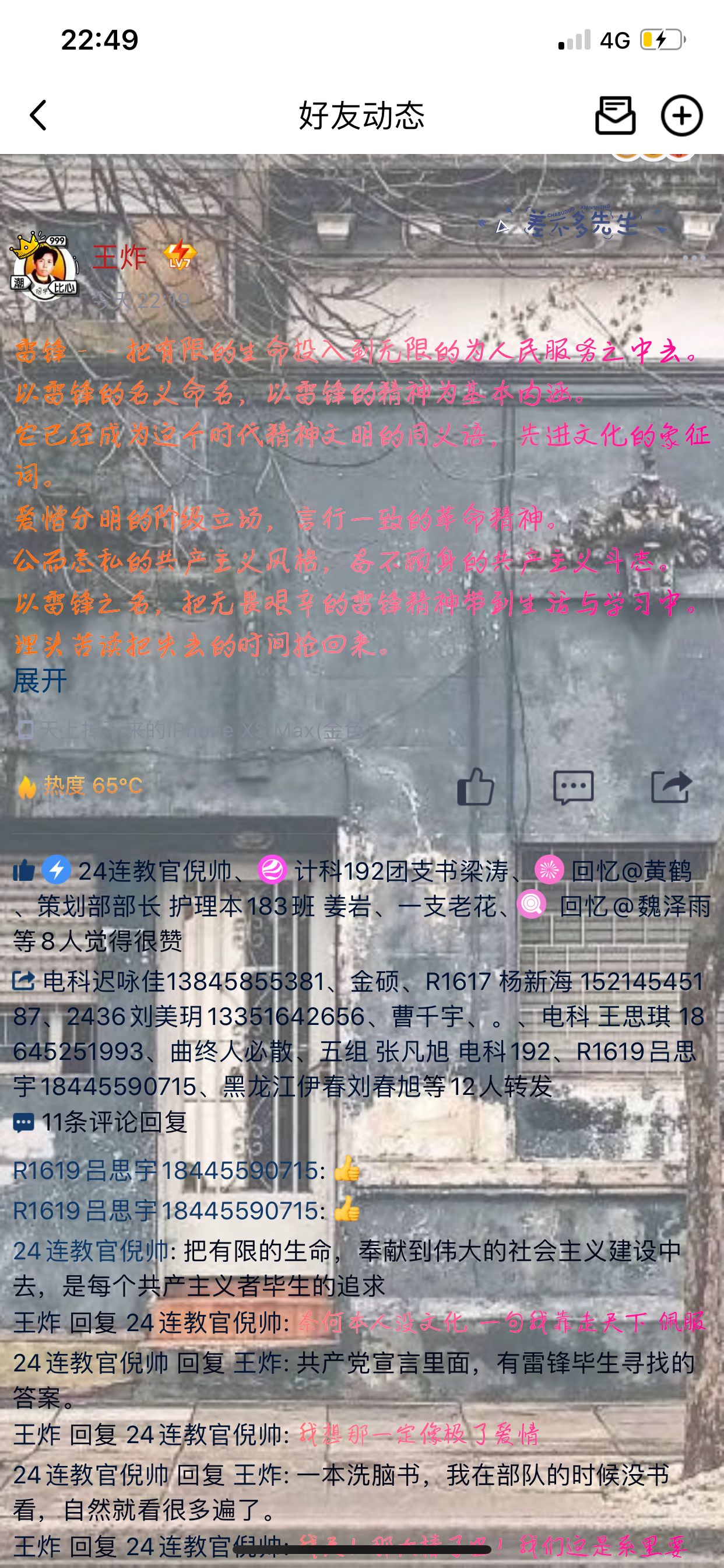 由于疫情原因,此次活动充分运用线上平台的优势,组织信息工程系学生们转载“雷锋——把有限的生命投入到无限的为人民服务之中去”主题宣传语,意寓传播“雷锋精神,人人可学。奉献爱心,处处可为。积小善为大善,善莫大焉。”的奉献精神,尤其面对这场突如其来的疫情,让同学们明白了当有人需要帮助时,大家搭把手、出份力,社会将变得更加美好,作为新时代的新青年更要忠实铭记爱党爱国爱人民的“赤子”精神,发扬助人为乐公而忘私的“奉献”精神,践行励志勤学刻苦钻研的“钉子”精神,学习忠于职守爱岗敬业的“螺丝钉”精神。