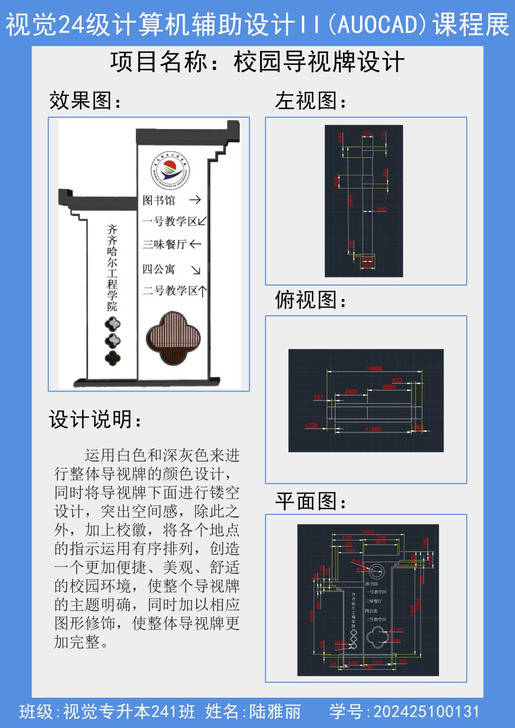 10月30日上午,视觉传达设计专业在一教四楼A区综合展示区举办专升本24级《计算机辅助设计IIAutoCAD》课程作品展,此次作品展由王慧茹老师指导,视觉专升本241班全体学生54人参加。