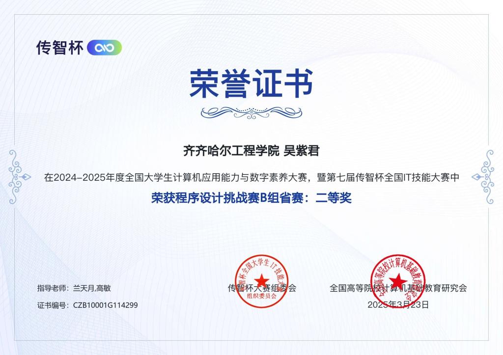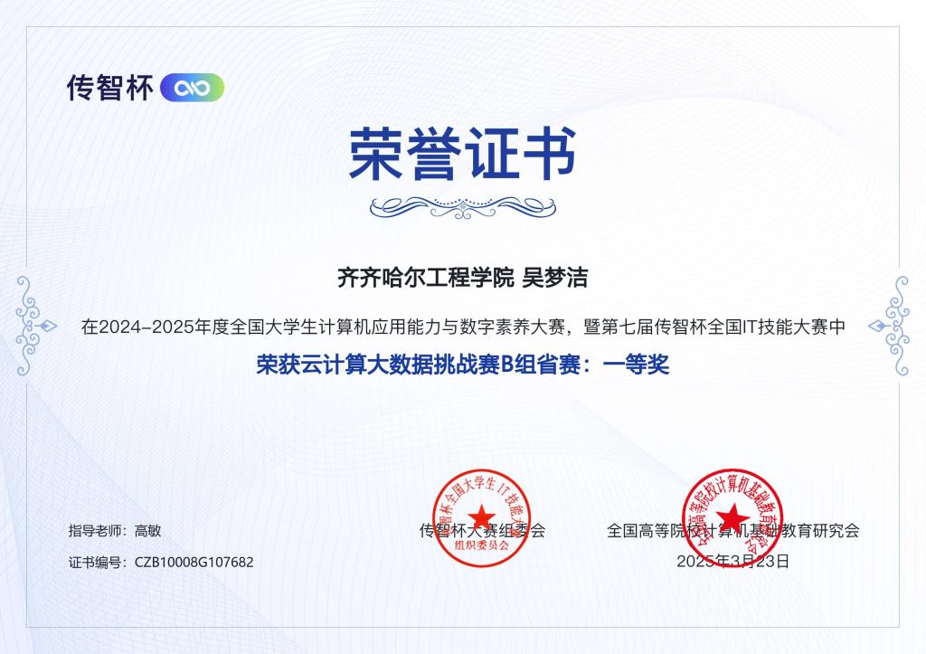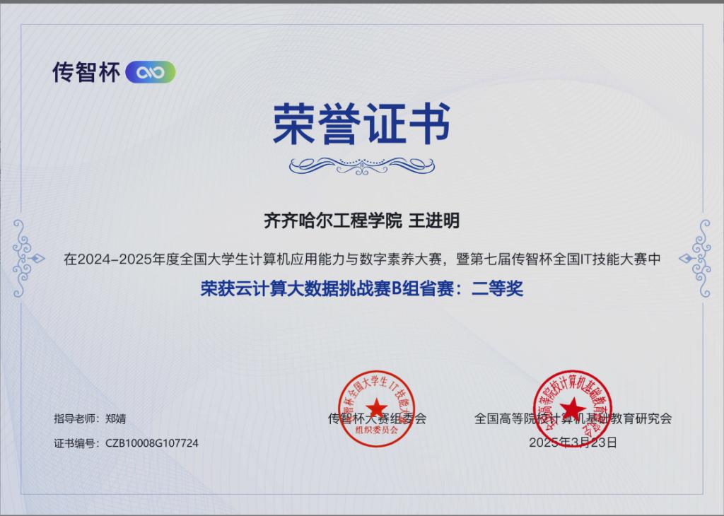 3 月 2 日,随着第七届 “传智杯” 全国 IT 技能大赛省赛落下帷幕,我校学生在此次大赛中取得了优异成绩。数据科学与大数据技术专业团队在程序设计挑战赛中表现突出,荣获 2 项省级一等奖、4 项省级二等奖。
