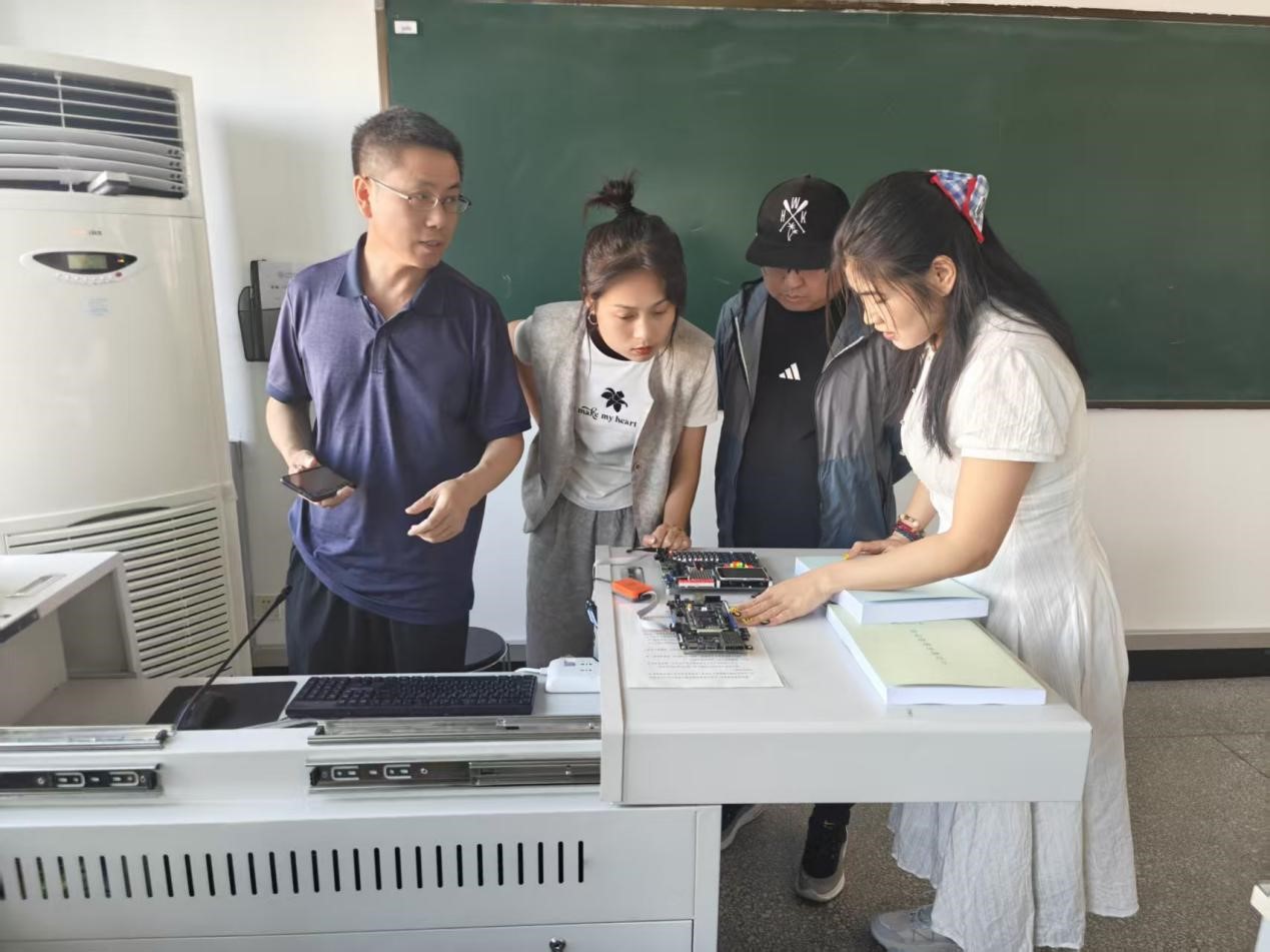 2025年6月17日,上午9点,在3教3301,青岛五谷树电子科技有限公司姚经理面向集电专业和电科专业的教师培训FPGAboxA1的使用流程和设备应用,集电专业张莹老师、李晨老师以及电科许可新老师参加此次培训。