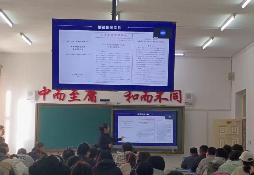 最后,郑婧带领同学们学习《高等学校科学技术学术规范指南》和《齐齐哈尔工程学院学术不端行为查处办法》,着重强调防控学术不端工作的重要性,明确告知同学们论文查重的合格标准、文献引用的规范格式,以及抄袭、篡改数据等学术不端行为的认定依据与处分后果。同时提醒同学们在合理安排时间、主动与指导教师沟通、严格按进度完成各阶段任务的基础上,务必将学术诚信贯穿毕设全程,从源头上规避学术风险,确保毕设工作规范、顺利推进。