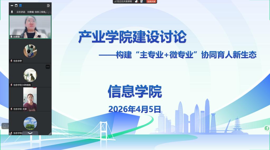 为深化产教融合,推进产业学院高质量发展,创新微专业建设模式,4月5日下午,信息学院组织召开线上专题研讨会。学院副院长刘春媛主持会议,院长郝丽娜、副院长曹竞时及全体专业负责人参加会议。