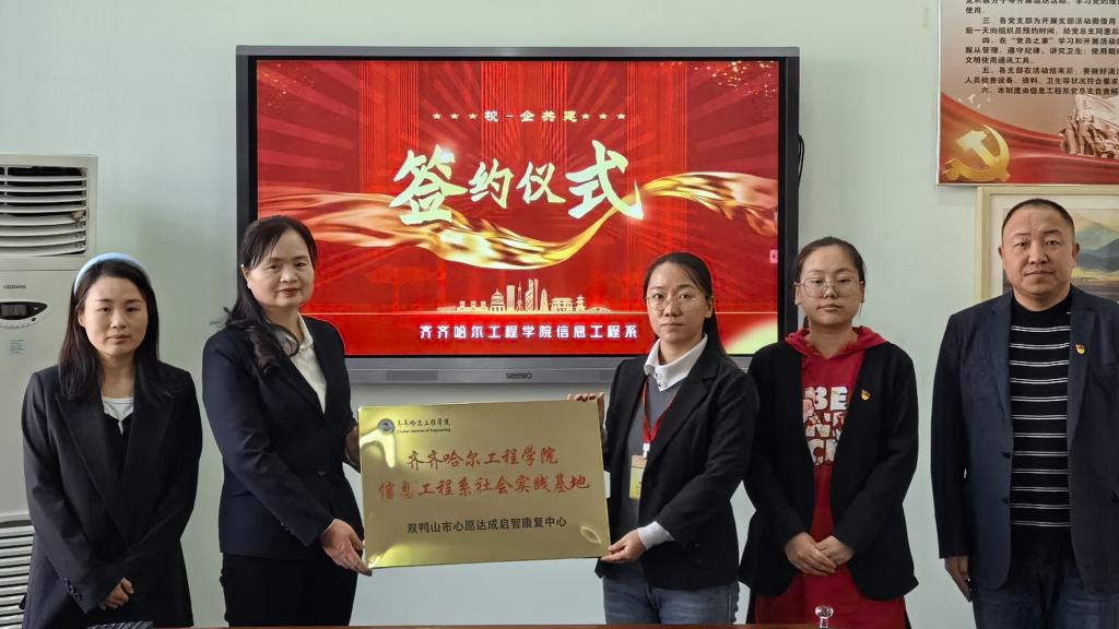 为落实立德树人根本任务,深化“五育”并举教育改革,培养德智体美劳全面发展的社会主义建设者和接班人。4月9日上午,信息工程系计算机科学与技术专业携手双鸭山市心愿达成启智康复中心,在一教学区2404会议室举办共建社会实践基地签约仪式。仪式由信息工程系负责人刘春媛主持,系党总支书记李野、党总支副书记孙晓芳、健康与护理系主任郭玲玲、计算机科学与技术专业负责人韩楠楠、双鸭山市心愿达成启智康复中心院长胡艳丽、教师陈卓参加本次签约仪式。