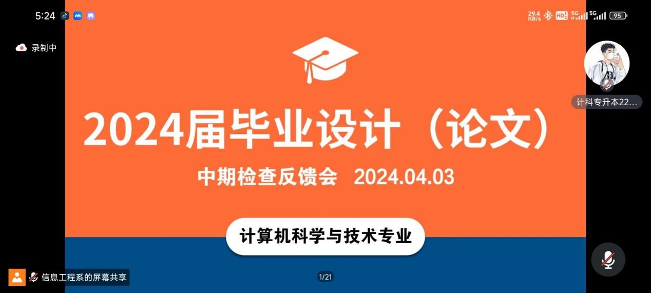 4月3日下午,计算机科学与技术专业在腾讯会议举行2024届毕业设计(论文)中期检查反馈会议,旨在进一步推进毕业设计(论文)工作的顺利进行,确保学生保质保量完成毕业设计工作。会议由专业负责人韩楠楠老师主持,计算机科学与技术2024届全体毕业生参加本次会议。
