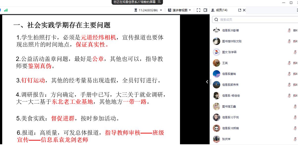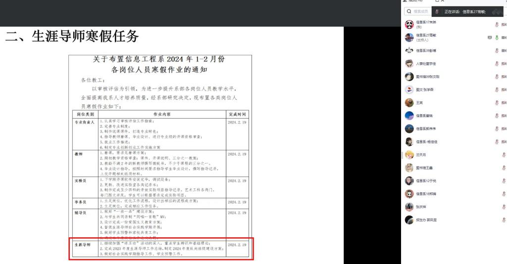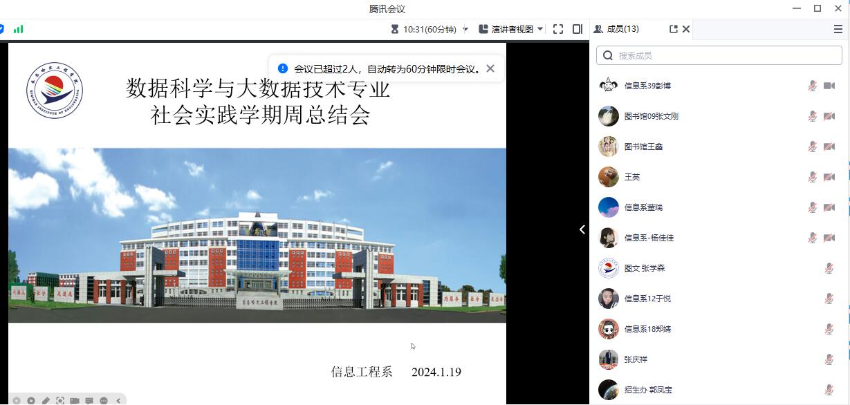 1月19日下午,数据科学与大数据技术专业长高敏通过腾讯会议召开第一次生涯导师社会实践学期周总结会议,专业全体生涯导师及辅导员参会。