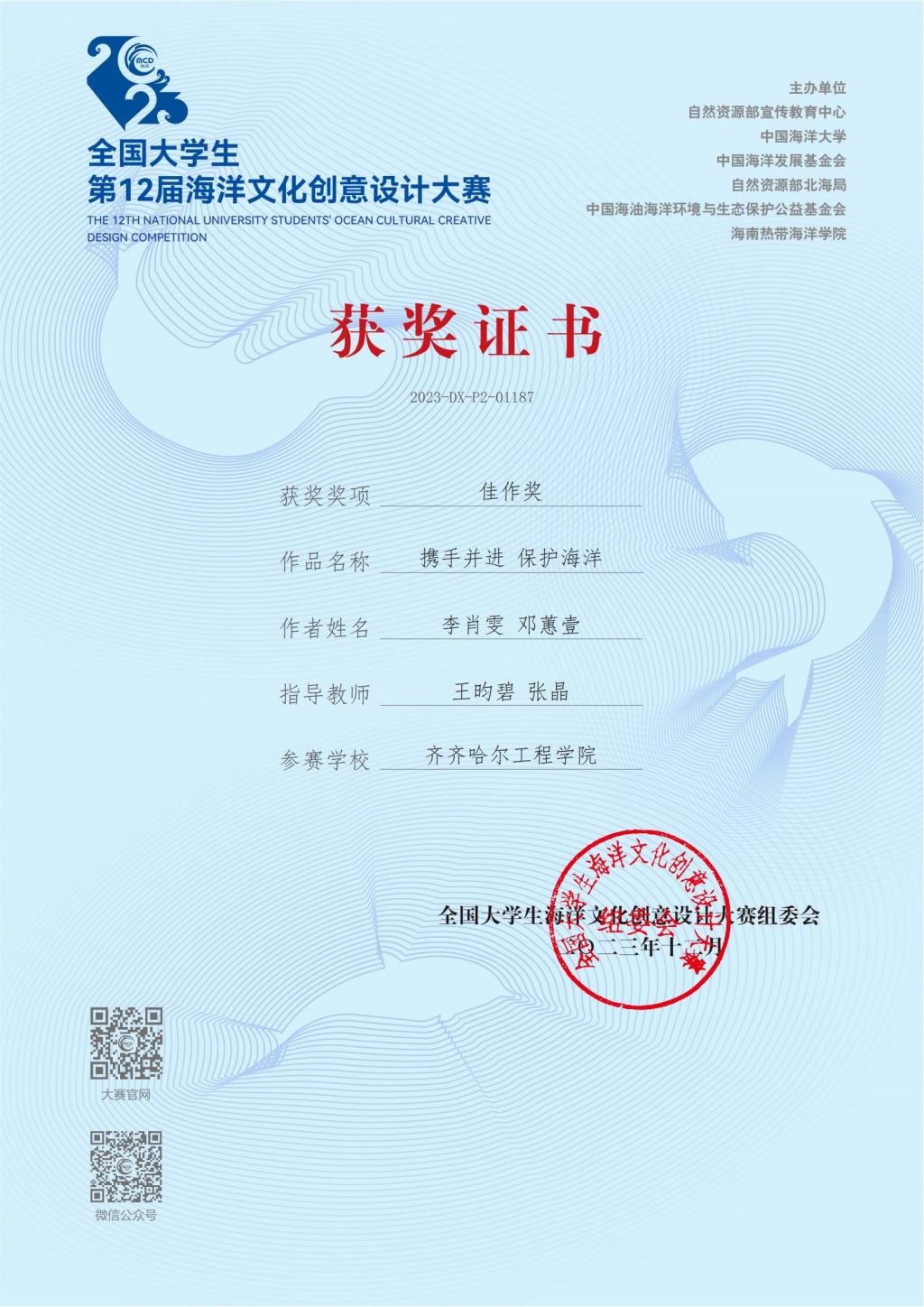 今年1月,在全国大学生第12届海洋文化创意设计大赛中,视觉传达设计专业21级学生李肖雯、邓蕙壹、熊小宁、康佳彤、姜雨梦、豆欣欣6名学生获得佳作奖。其中,齐齐哈尔工程学院组织工作出色,参赛成绩显著,被授予“优秀组织奖”。