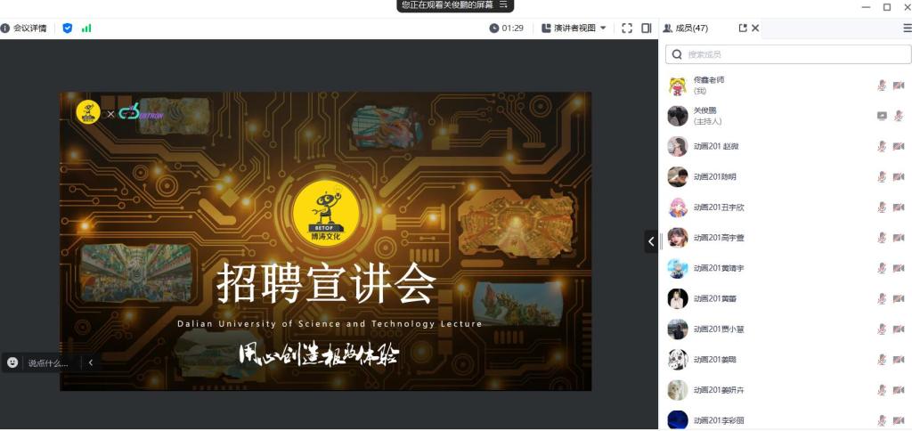 为促进学生就业,提高学生就业质量,动画专业教师积极与企业沟通挖掘就业资源。12月12日上午,动画专业长佟鑫老师及专业老师刘沣元组织下,辽宁省大连市博涛文化有限公司通过线上直播的形式,为动画201班的全体同学带来了—场精彩的招聘宣讲会。会前佟老师强调,同学们可以通过企业宣讲认清就业形式,岗位需求,珍惜在校时间抓紧查缺补漏提升自己的专业能力。