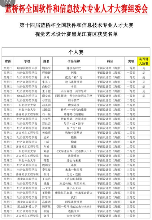 近日,第十四届蓝桥杯全国软件和信息技术专业人才大赛,视觉艺术设计赛黑龙江赛区比赛结果公布,我校学子在大赛中取得优异成绩。
