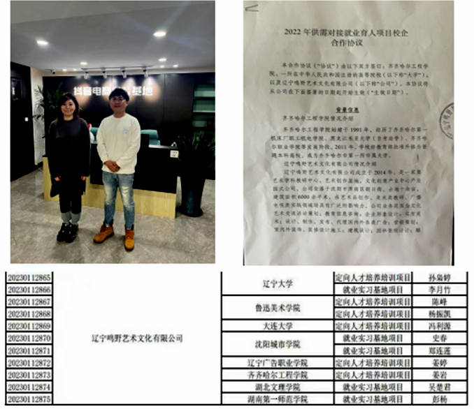 辽宁鸣野艺术文化有限公司是教育部供需对接的互联网型经济传媒公司,公司设计经验丰富,同时也进行大学生创业项目的建设。我校任杰和王昀碧老师赴辽宁与鸣野艺术文化有限公司就双方协同育人项目进行中期准备,在交谈过程中,展示了我校在设计、教育教学模式以及互联网创新等方面的优势,同时,也看到了辽宁鸣野艺术文化有限公司与多所学校在就业实习基地项目以及定向人才培训项目上的合作优势。与辽宁鸣野艺术文化有限公司进行合作,既可以为我校学生提供教育教学与就业实践的培训基地,也可以向社会输送有用人才,对学校以及公司都是互赢的项目。