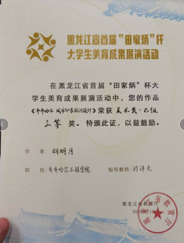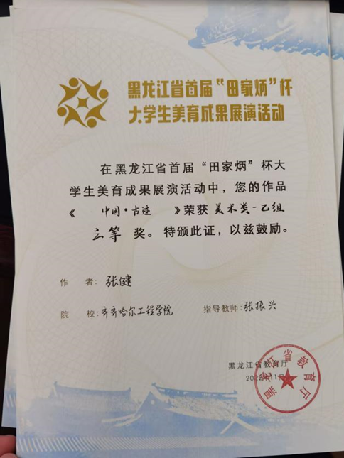 截止4月5日,以“美育中华情”为主题的黑龙江省教育厅主办的黑龙江省首届“田家炳杯”大学生美育成果展演活动已完成全部评审工作。我校选送的作品中10件获奖,其中张健等3人获得三等奖,赵微等7人获得优秀奖。
