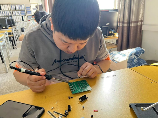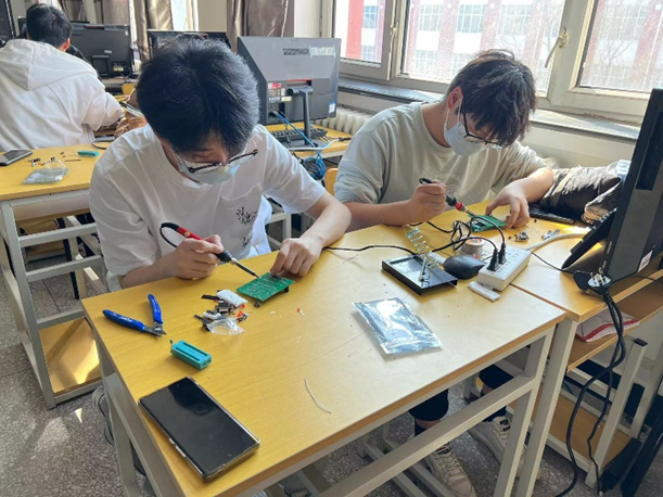 本次实验项目是进行51单片机最小系统板焊接实验,锻炼学生的动手实践能力。首先张鑫老师将教师集体备课中所学习到的经验融入课堂,为同学们介绍了焊接的基本操作步骤和注意事项,并对此次实验成果的达成提出了要求。接下来,张鑫老师动手焊接,为同学们进行示范性操作,针对一些特别需要注意的实验操作,进行重点强调。随后,由学生们自己动手进行实物焊接。在焊接实物的过程中,同学们遇到了各种各样的问题,包括元器件的反接,元器件损坏等问题。最后,张鑫老师的指导下,各位同学均完成了单片机最小系统的焊接,并成功制作出实物。