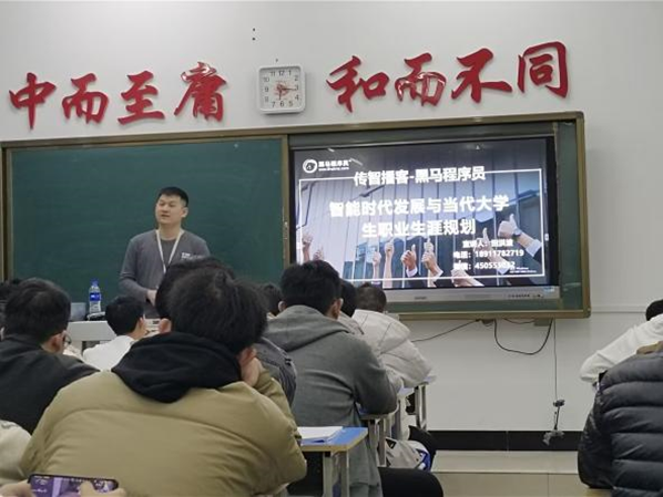 会上,田经理介绍了当代大学生就业状况,根据调查显示,上月份城乡就业率对比往月降低了5.7%,就业情况不容乐观。接下来,田经理讲述了智能时代行业的四大优势,包括行业普遍薪水高、社会地位高、技术性工作确定及行业发展潜力巨大,引导同学们思考未来的就业方向、薪资片酬等,并展示出相关职业在一线城市与二线城市的薪资,让同学们大致了解用人单位的薪酬。最后,讲解了大学生职业生涯规划,以为自我定位、环境分析、确立志向和职业规划,这四步来确定同学们的就业生涯规划,强调大学生要注重培养实践能力,大学生的综合实力和知识面是用人单位选择大学生的依据。