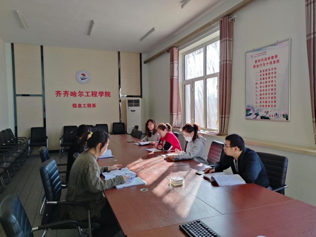 各专业已经在开学前对期初教学文件的准备情况进行自查,本次姜主任组织各专业长再次进行系里检查,抽查了六位老师的七科教学文件。从开课说明、教学大纲、学情分析、学习手册、教案、项目作业指导书、实验实训指导书等方面检查教师教学文件的准备情况。尤其是任新课和新任课的老师,重点关注新教师的教学文件的规范性,减少出现格式问题的低级错误,也强调了材料的一致性。还要求教师在教学文件中要有信息工程系教学基本规范,这样可以自己根据教学基本规范查找自身教学的不足。检查中,各位专业长针对每位教师的教学文件给出了整改意见,对于低级的格式错误绝不姑息,但经验上的不足允许新教师逐渐积累,逐步完善。