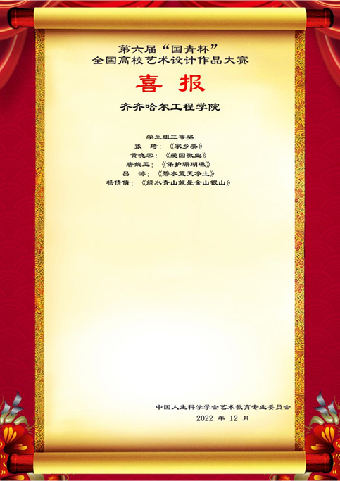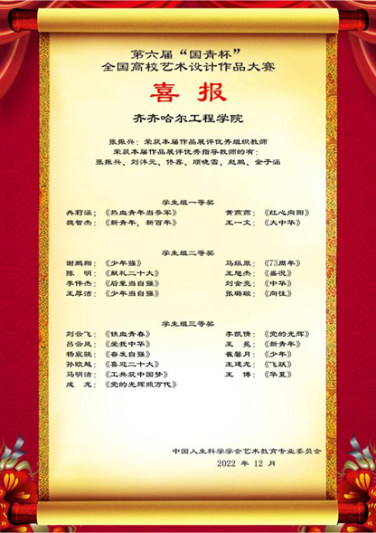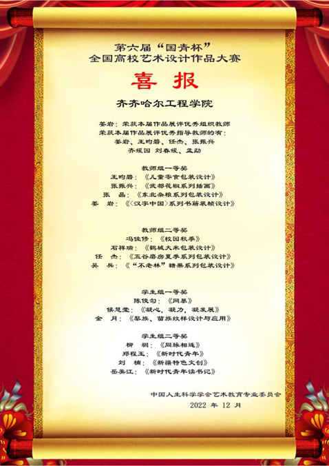 大赛旨在探索艺术设计教育发展新趋势,提高艺术设计人才培养能力,为广大高校师生搭建一个相互交流和提高的平台,推动高校艺术设计教育的改革与发展。坚持以社会主义核心价值观为引领,坚持以美育人,引导学生树立正确的审美观念,陶冶高尚的审美情操,培养德智体美劳全面发展的社会主义建设者和接班人。最终我校姜岩等4名教师获得教师组一等奖,任杰等4名教师获得教师组二等奖。陈俊匀等7名学生获得学生组一等奖,柳圳等12名学生获得学生组二等奖,张琦等16名学生获得学生组三等奖。