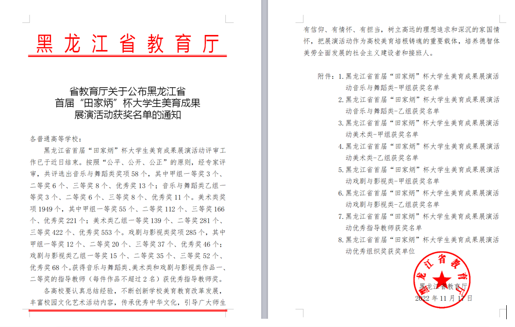 近日,以“美育中华情”为主题的黑龙江省首届“田家炳”杯大学生美育成果展演活动已完成全部评审工作。我校选送作品中共有10项作品获奖,其中三等奖3项、优秀奖7项。