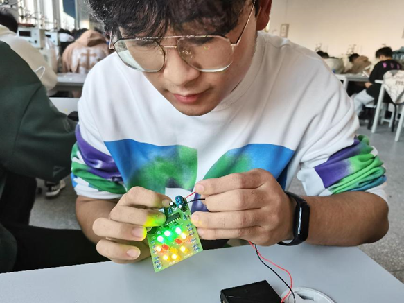 此次项目在专业的前瞻课程基础上开展,促使同学们进一步深入了解专业。本次实验项目是进行PCB板焊接实验,锻炼学生的动手焊接能力。张莹老师为同学们介绍了焊接的基本操作步骤和注意事项,学生以个人为单位完成焊接任务,确保每个学生都参与实际操作。由于操作经验有限,实验中出现了焊坏元件、焊点不可靠、不美观等情况,张莹老师针对这些情况进行了指导,同学们在课程结束后都完成了项目任务,并成功制作出实物。