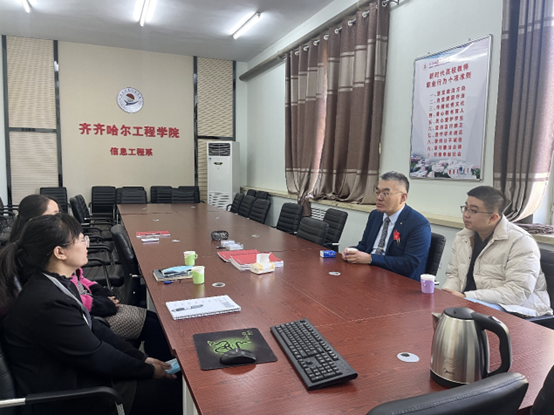 为加强校企合作,拓宽学生就业渠道,10月5日上午,信息工程系主任刘春媛、数据科学与大数据技术专业负责人高敏,与齐齐哈尔智洋科技有限公司投资人王热、项目经理郑琛就校企合作事宜进行深入洽谈。