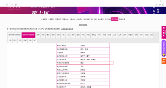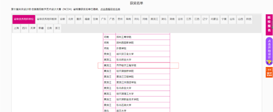 6月中旬,全体选手通过官网提交参赛作品。经过初赛,众多选手设计的作品均进入决赛。决赛中,我校获得省级优秀组织单位奖、我校姜岩老师获得省级优秀组织教师奖。荆晓娜、柳圳、周震海同学的参赛作品获得黑龙江赛区一等奖。曲敬娴、杨倩倩、陈玲、王智颖、范玉伟同学的参赛作品获得黑龙江赛区二等奖。孙红梅、杨恩萍、张健、石一凝、蒲冬英、乐文浩、陈俊匀同学的参赛作品获得黑龙江赛区三等奖。