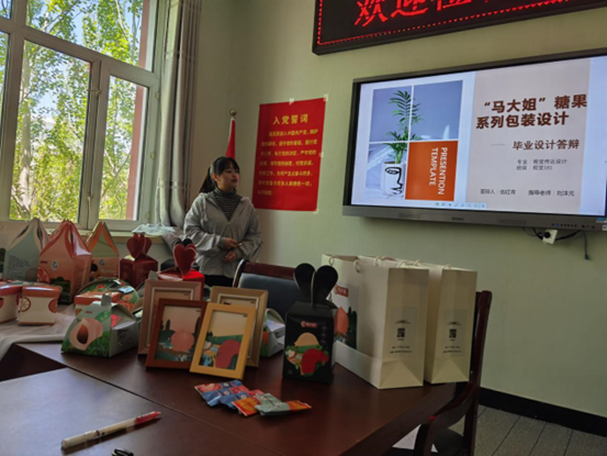 在答辩过程中,每位同学要通过PPT汇报和实物展示相结合的形式对自己的毕业作品和设计内容依次从选题依据、研究内容、拟解决的问题、设计创新点和预期设计成果进行了自述,针对老师提出的问题进行了详细的阐述,答辩组专业老师就学生汇报的内容逐一进行点评,在指出选题中存在的具体问题的同时提出修改意见。在整个过程中,同学们表现的积极大方,语言表达流畅,师生互动气氛融洽,充分展示了视觉传达设计专业学生扎实的理论基础和专业能力,答辩过程十分顺利。