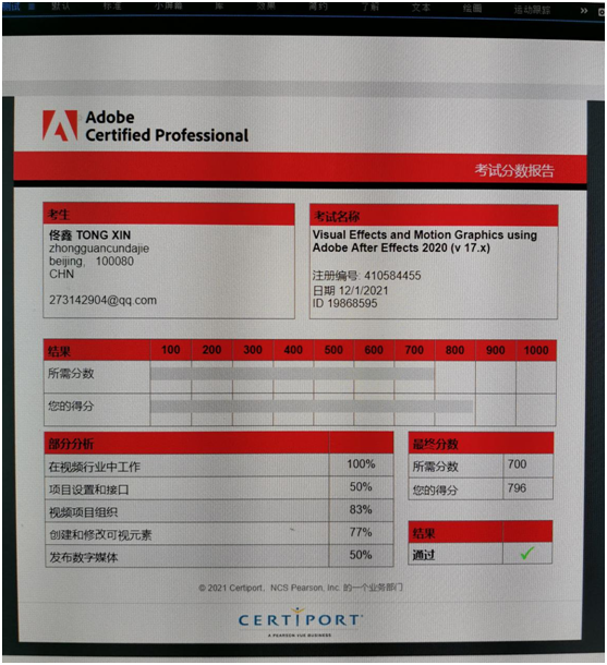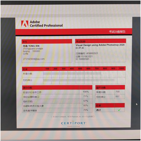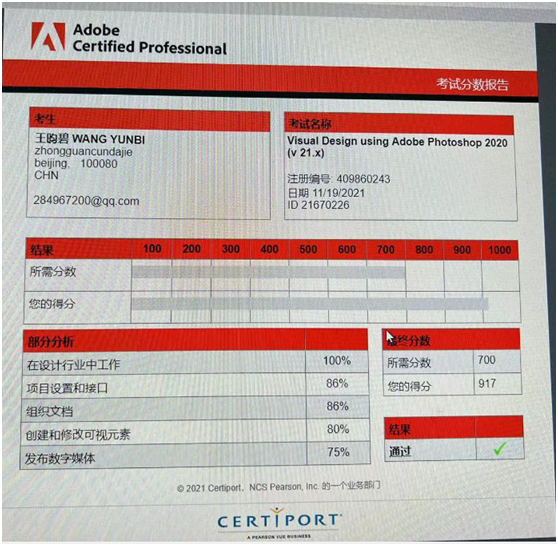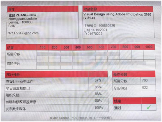 11月19日至12月2日,视觉传达设计和动画两个专业的教师张晶、王昀碧、刘沣元、佟鑫,通过网络平台报名参加了线上Adobe国际认证考试,并先后取得了优异成绩,通过率达100%。