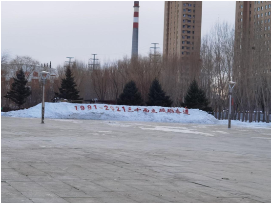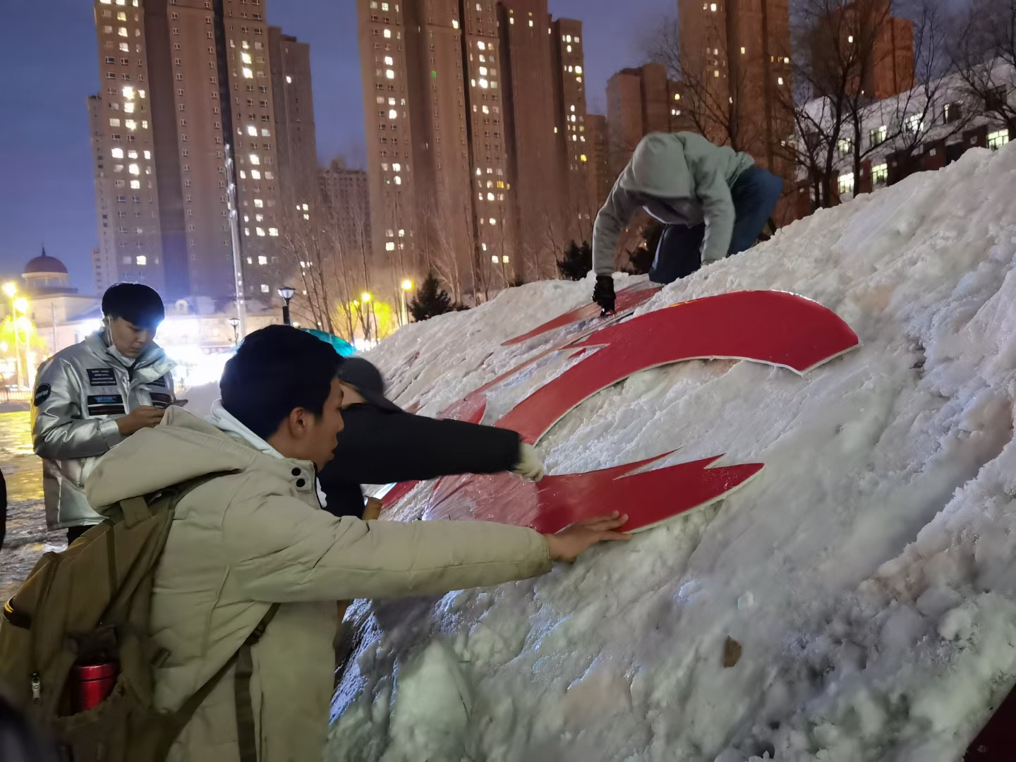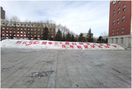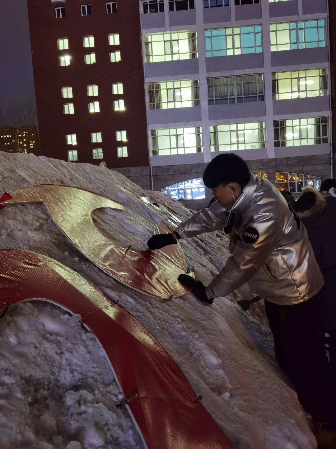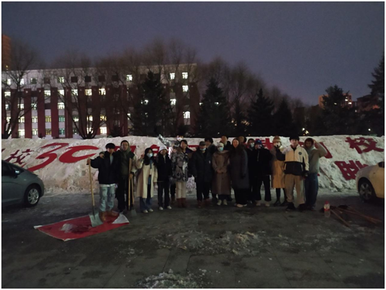 下午,老师和同学们分成两组进行制作雪景。将已经做好的字体与雪堆进行结合,用树枝和铁丝将两者进行固定,又倒水进行冰冻,手套都被水湿透,手冻的通红,但寒冷的天气却没有阻挡同学们的热情。制作中分工明确、合作默契,听从老师指导。在老师们和同学们的共同努力下,完成了明德广场东西两侧雪景,并集体合影留恋。