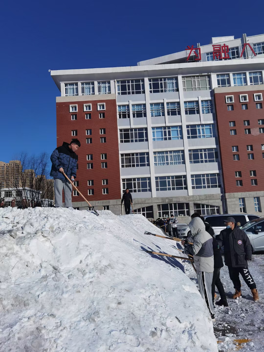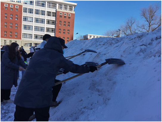 当日上午,同学们来到明德广场,分别将东西两侧堆好的雪堆修平。同学们积极主动、相互配合、齐心协力,挥舞着铁锹,一派热火朝天的景象,一点点地将雪墙上面凹凸不平的地方找平,尽管大家的脸都冻得通红,但手中的工具却不停地挥舞着,忙得浑身是汗。老师与同学们在欢声笑语中将雪景基座修整成雏形,修整的整整齐齐。