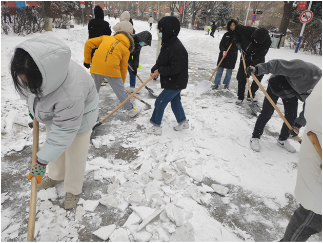 虽然室外的温度已跌破冰点,但大家劳动的热情和团结的力量让这个冬日变得格外温暖,无论男生女生,都拿起工具,全力以赴,分工协作,共同努力下,将积雪清理干净。