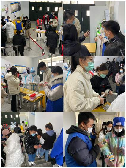 党员志愿者们于早上8点在核酸检测地点集合完毕,在接受合理的安排后,迅速进入自己的岗位,开始了紧张有序的工作。有的志愿者协助医护人员进行身份核验和采样信息录入,有的志愿者在楼梯口、走廊控制检测人员数量,引导人员分流入场,有的志愿者在排队等待区维持秩序,引导等待检测的师生准备好相关证件的准备,提前完成扫码预约,提高检测效率,有的志愿者参与后勤工作,负责物资和设备的搬运、维护,确保核酸工作顺利的进行。