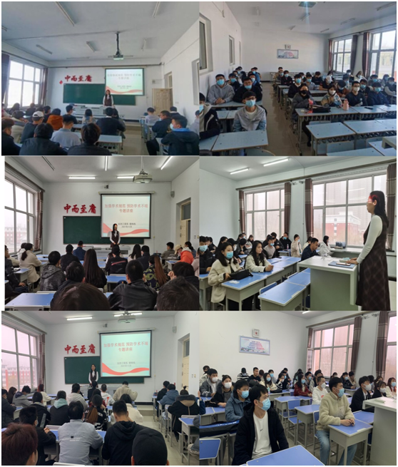 郭老师以“身边的案例”警示教育开始讲座,提问同学们学习《齐齐哈尔工程学院学位论文作假行为处理实施细则》情况,根据学生对学术不端行为的认识程度,从什么是学生不端、常见的学术不端行为、学术不端行为如何处罚、如何杜绝学术不端四个方面,有针对性地讲授如何加强学术规范,预防学术不端,还介绍了如何正确使用参考文献等。