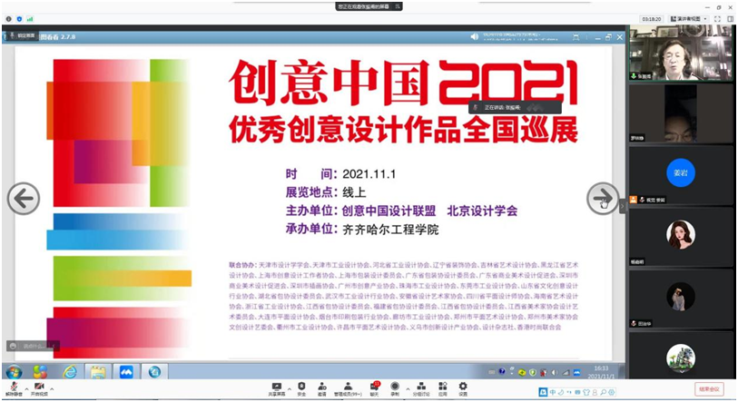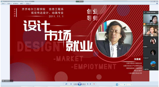 11月1日下午, 视觉传达设计专业和动画专业联合举行线上“设计、市场、就业”专家讲座,特邀创意中国设计联盟主席、全国文创设计产业联盟主席、高级工艺美术师、博土生导师、一级注册艺术设计师张震甫教授主讲,通过腾讯会议台,由视觉传达设计专业长姜岩主持,视觉传达设计专业全体学生和动画专业20级学生,共300余人参加了此次讲座。